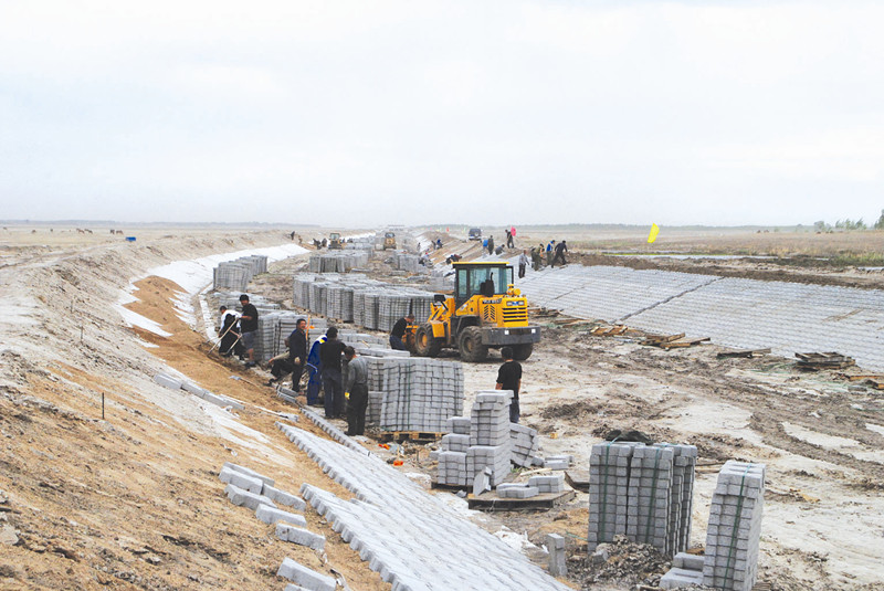 图②建设中的河湖连通工程——创业水库干渠板块护坡。马明印/摄
