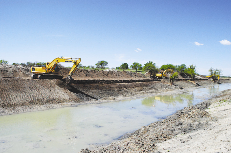 图①建设中的河湖连通工程——兴隆水库干渠削坡施工。