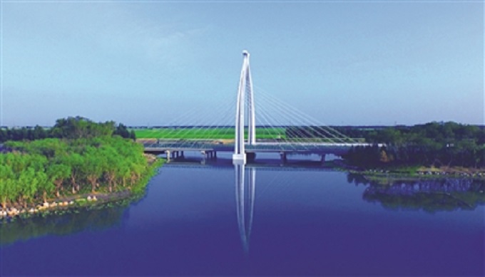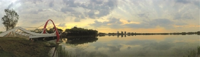鹤鸣湖公园景观工程是白城市生态新区景观工程的重要组成部分,总建设面积94公顷,其中水体面积52公顷。公园由“一湖、三岛、九桥、一心、多点”构成,既可满足城市商业休闲、市民滨水游憩和文化娱乐活动,又是海绵城市的范例工程。它是具有吸水、蓄水、净水和释水功能的城市海绵体,充分利用了“引、渗、滞、蓄、净、用、排”专业技术,集中体现海绵城市理念。