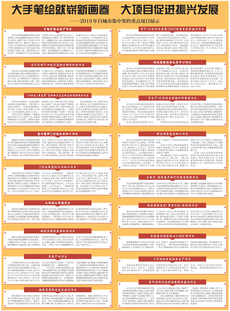 4月17日,白城市重点项目签约仪式暨重点产业项目发布会在白城宾馆举行。此次集中签约项目共18个,合同投资总额达到141亿元,主要涉及氢能产业、燕麦深加工、农畜产品加工、现代物流、文化旅游等行业领域项目。