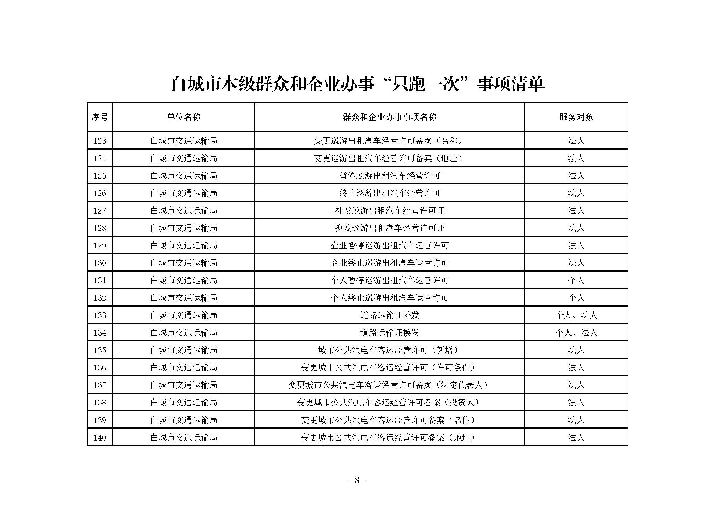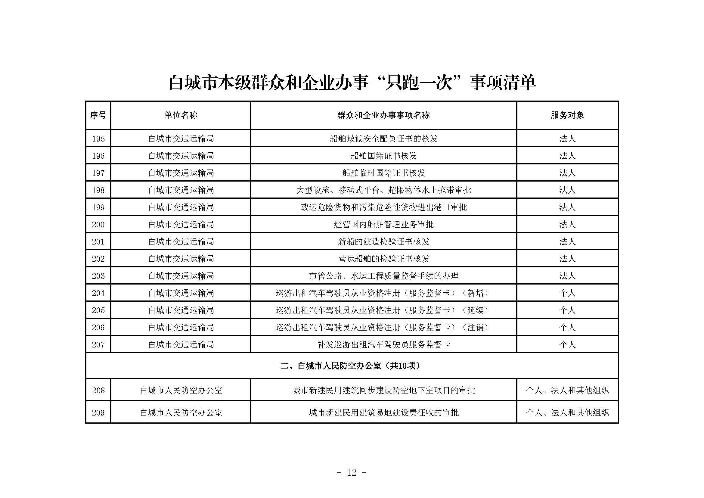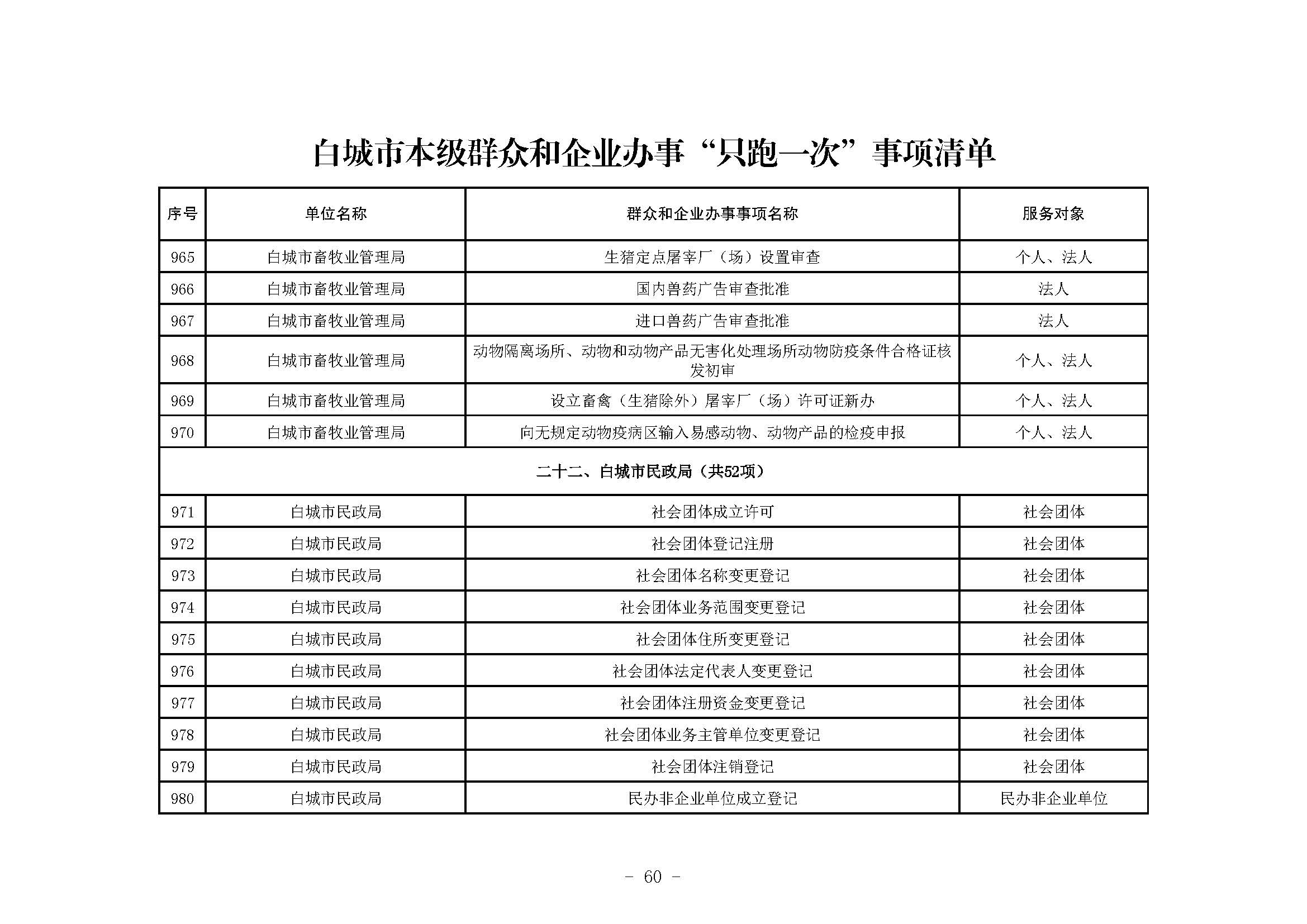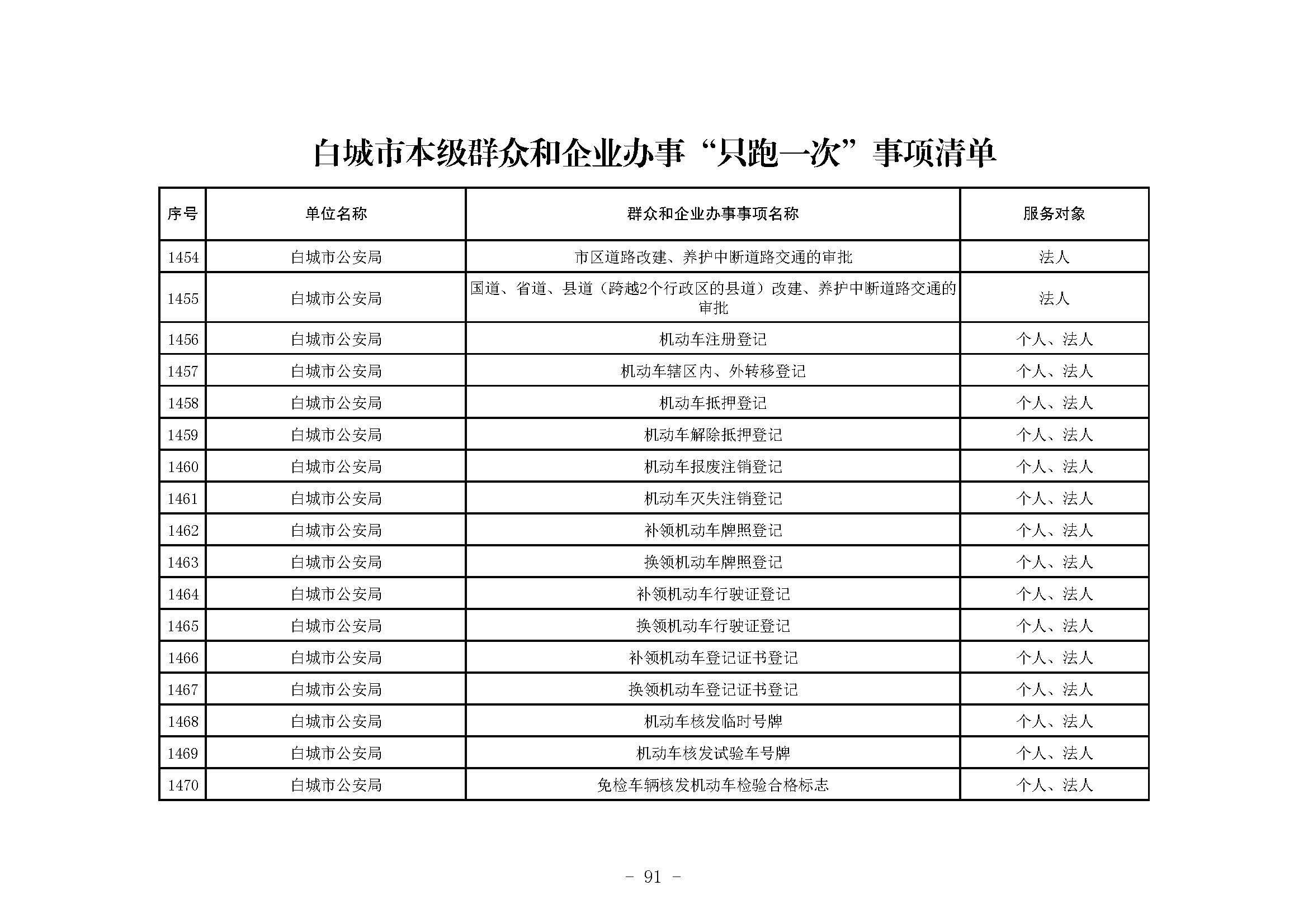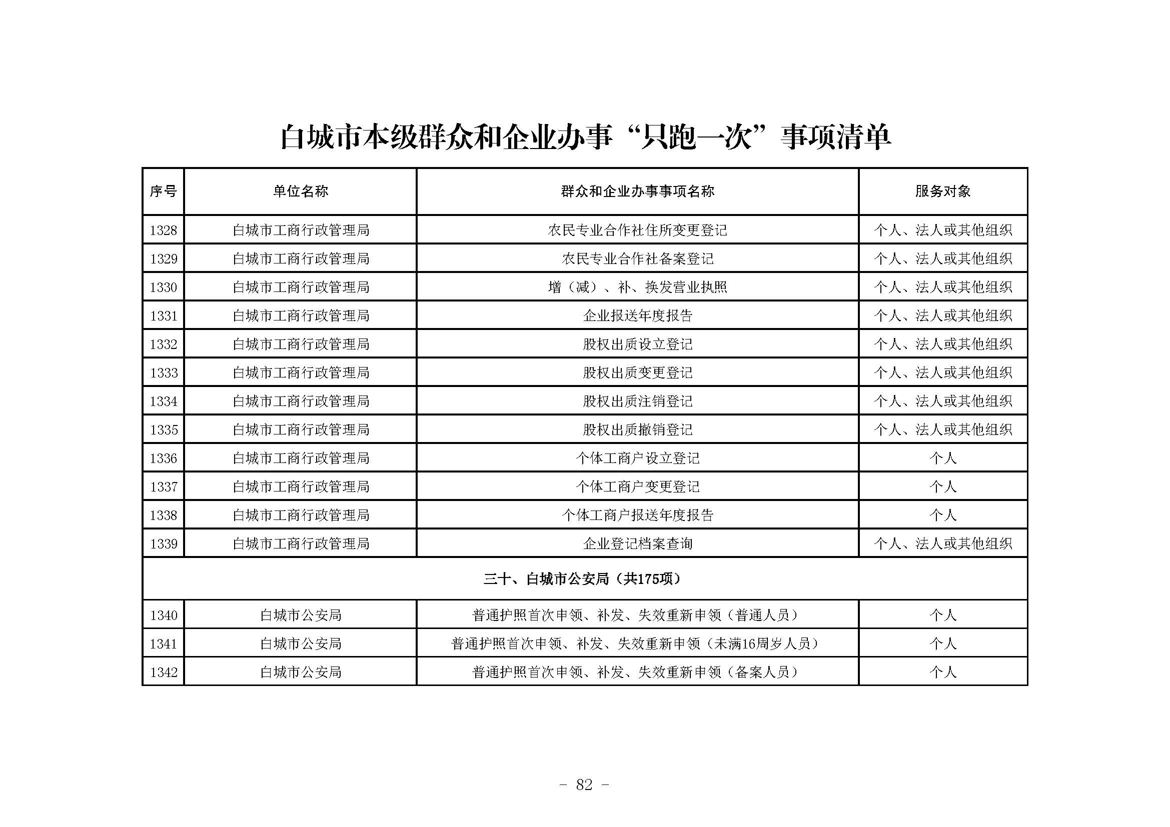 白城市市本级群众和企业办事“只跑一次”事项清单