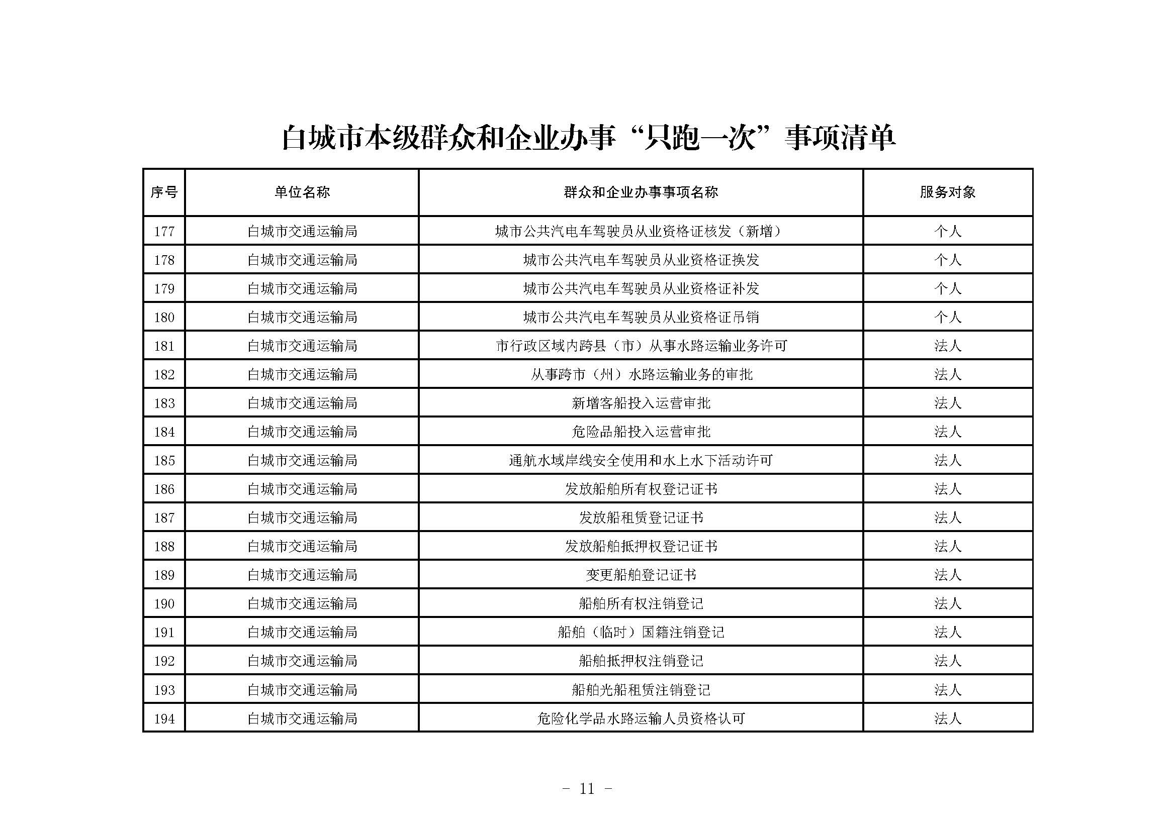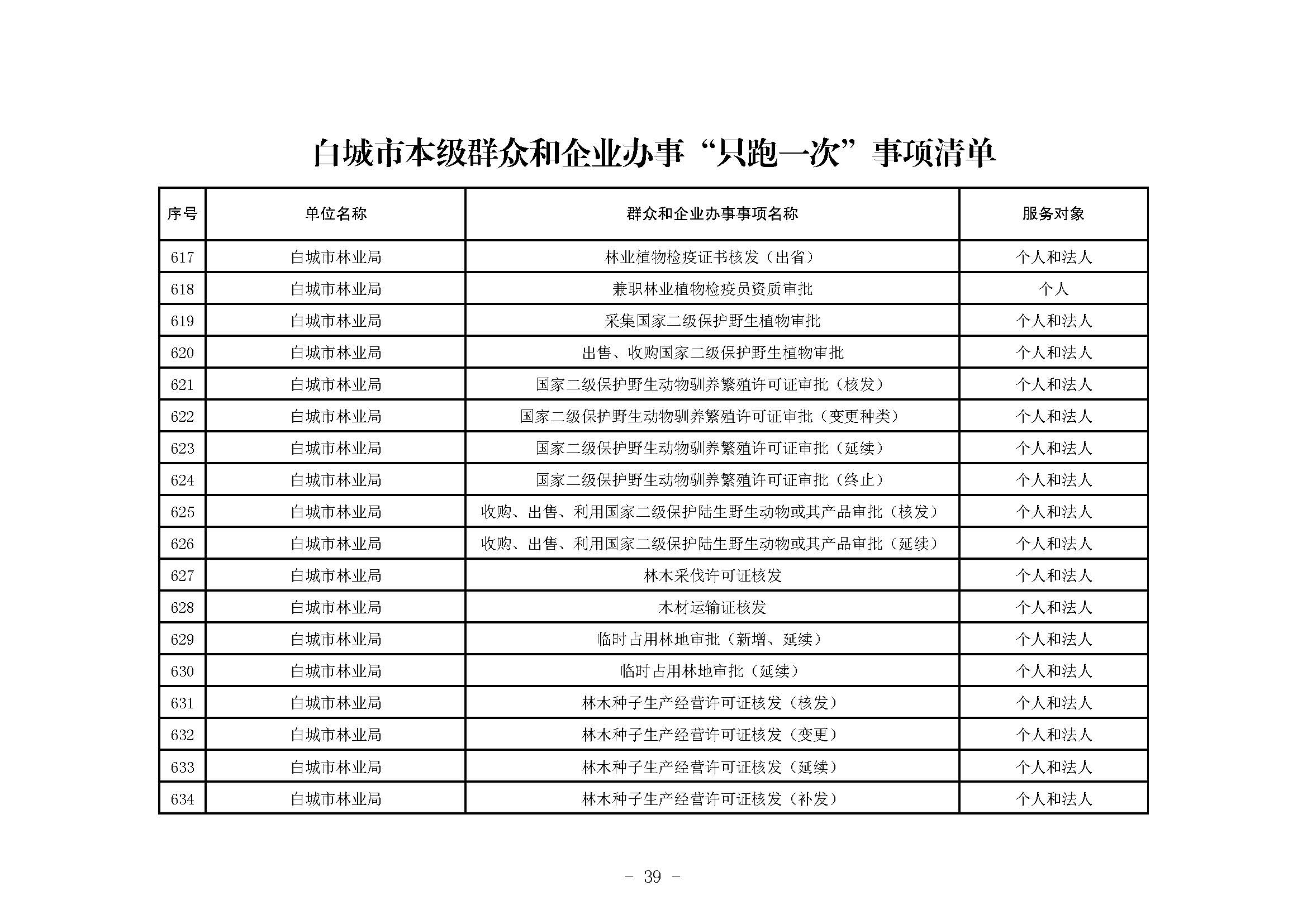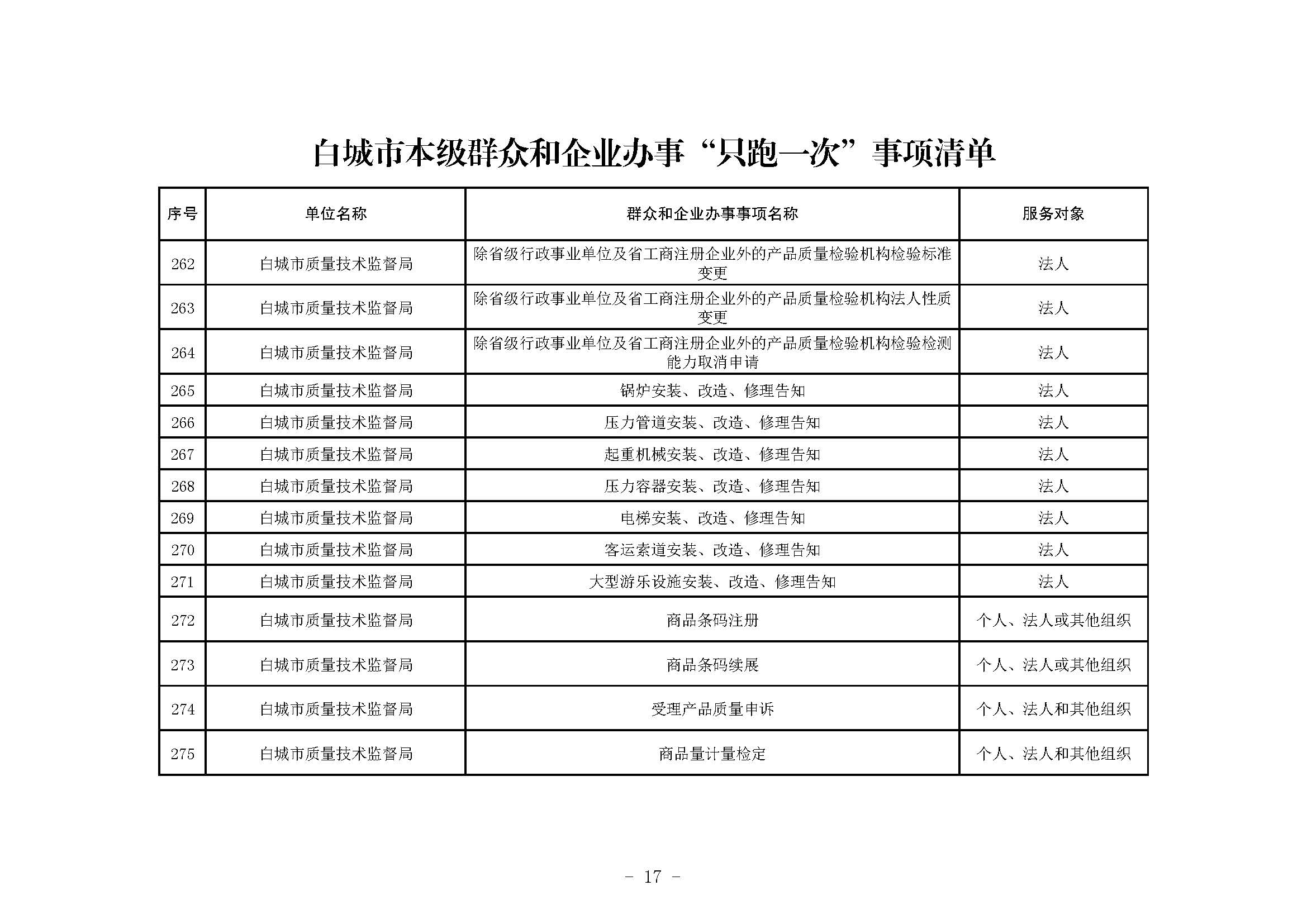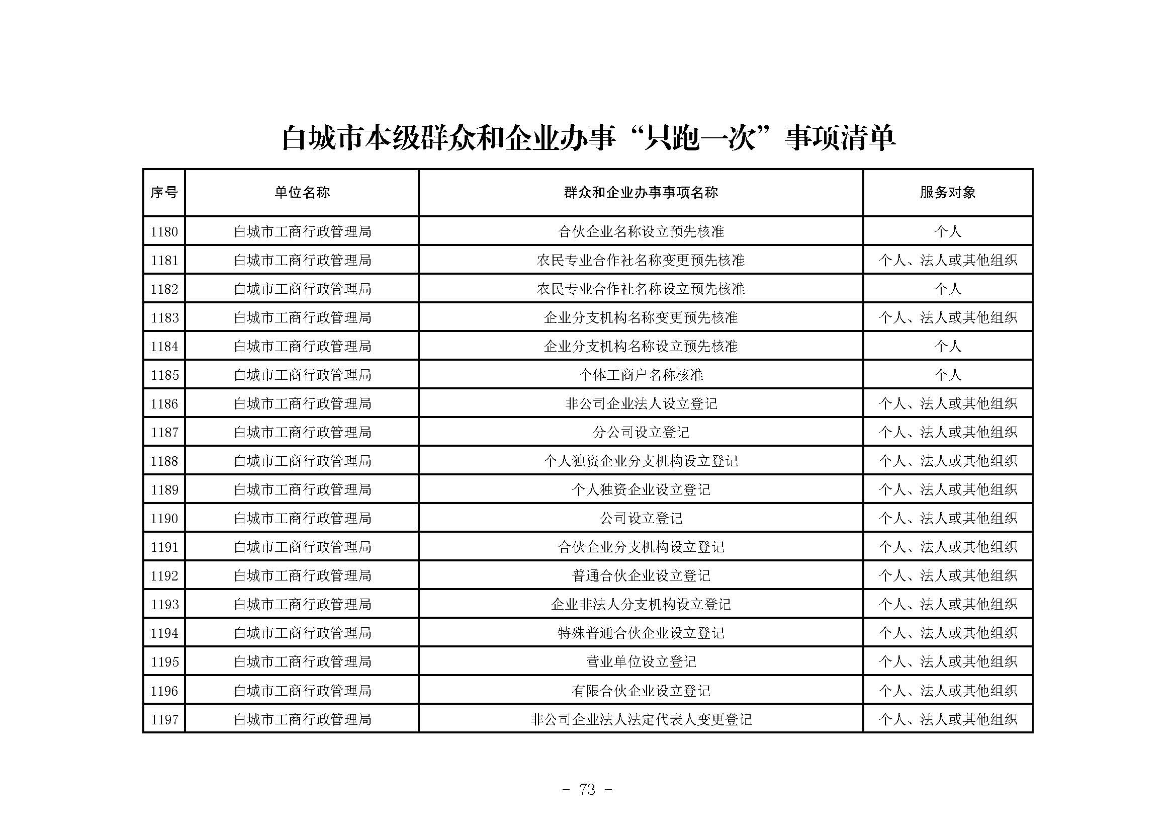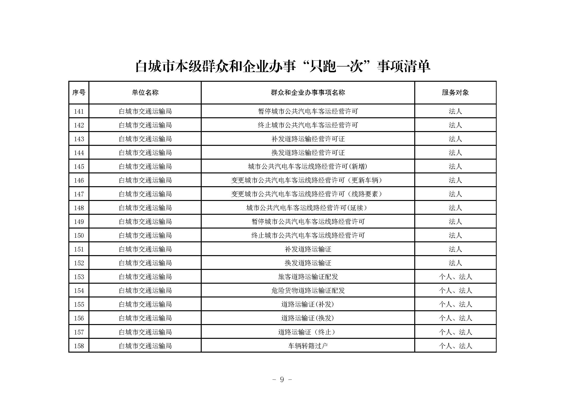 白城市市本级群众和企业办事“只跑一次”事项清单