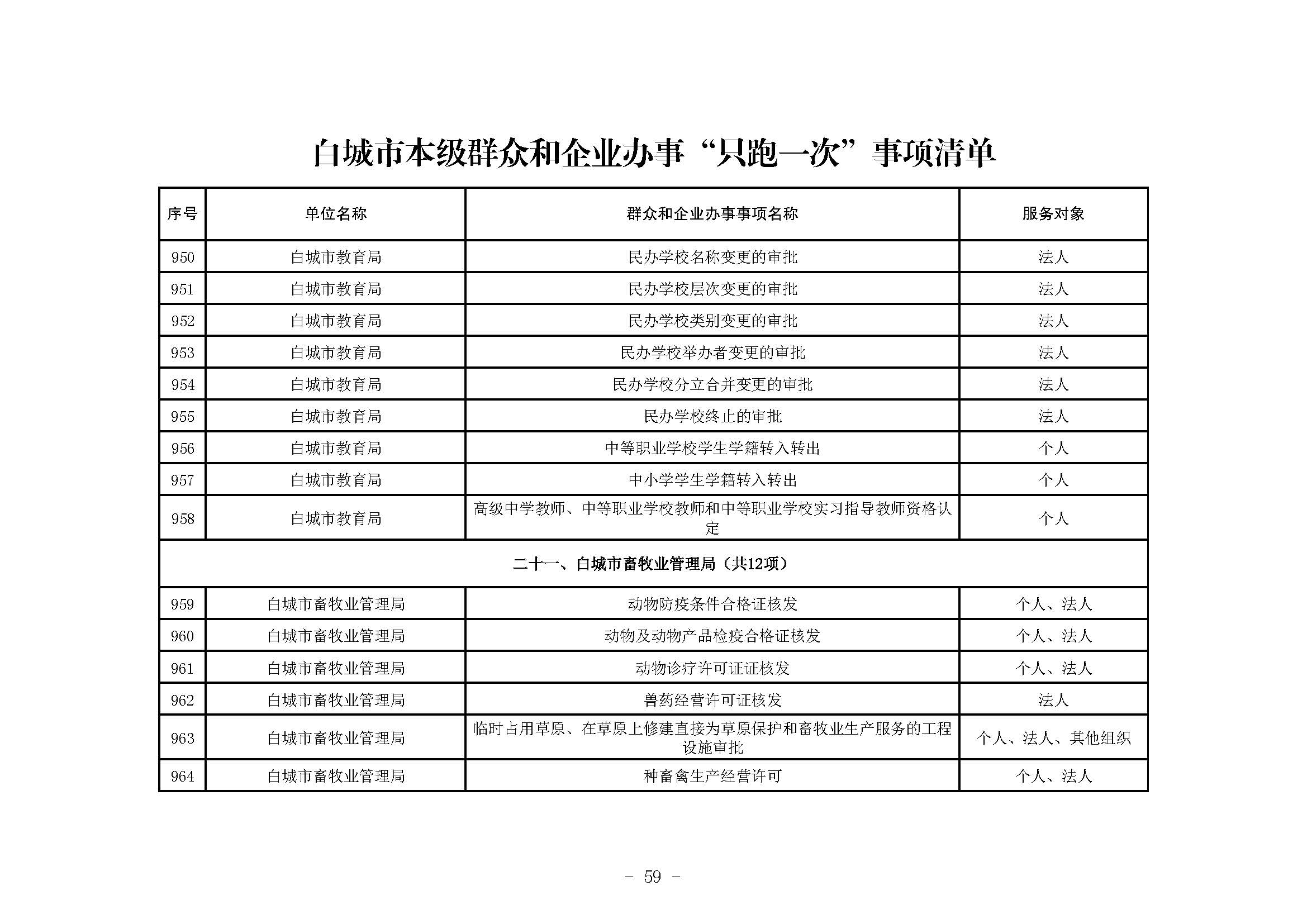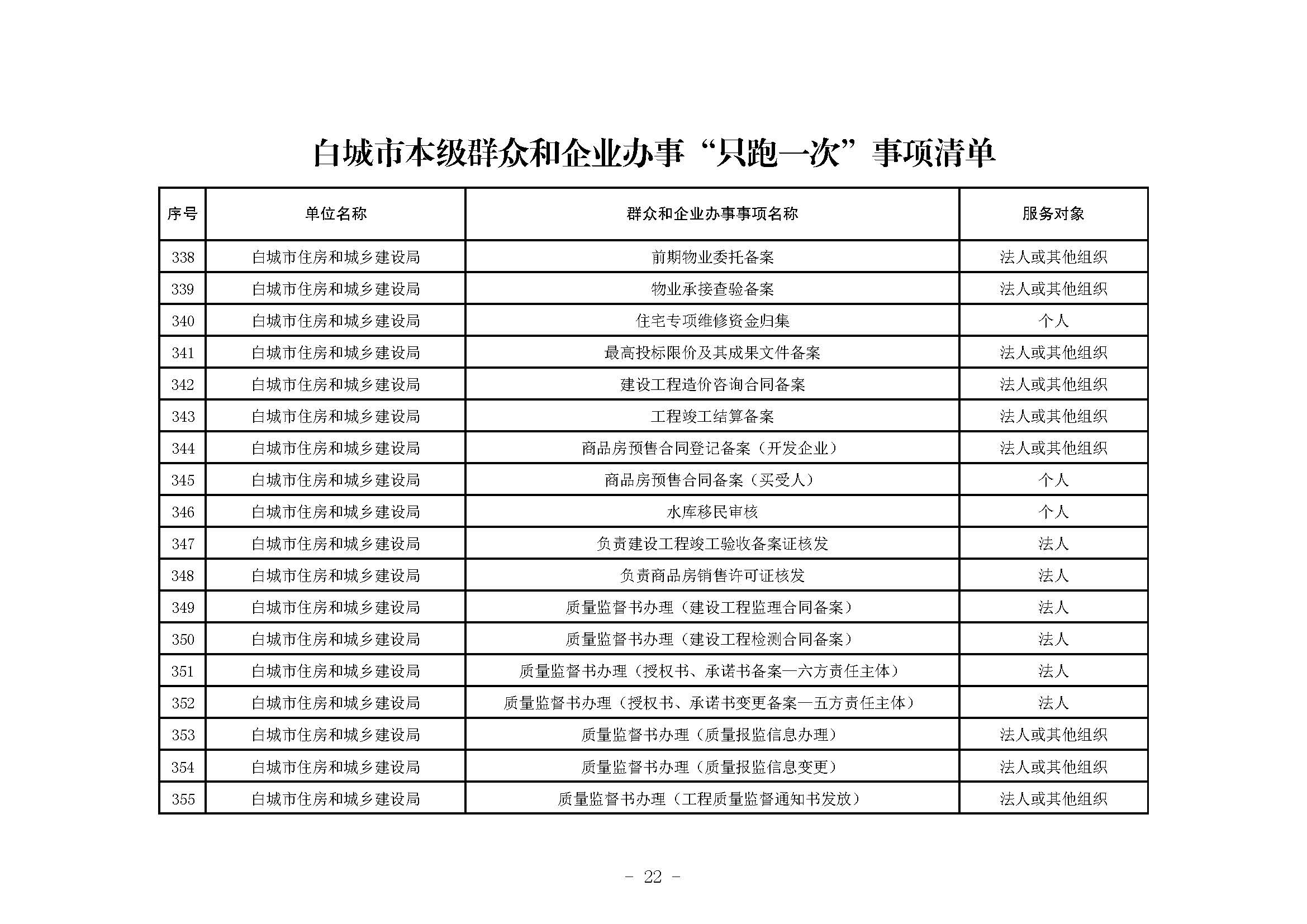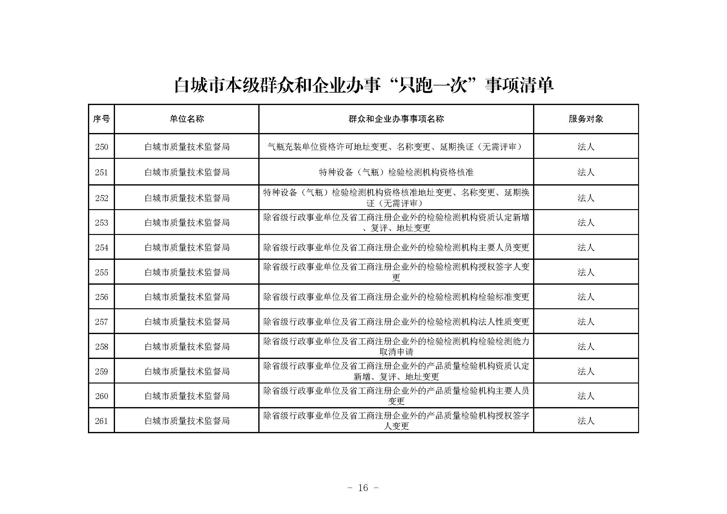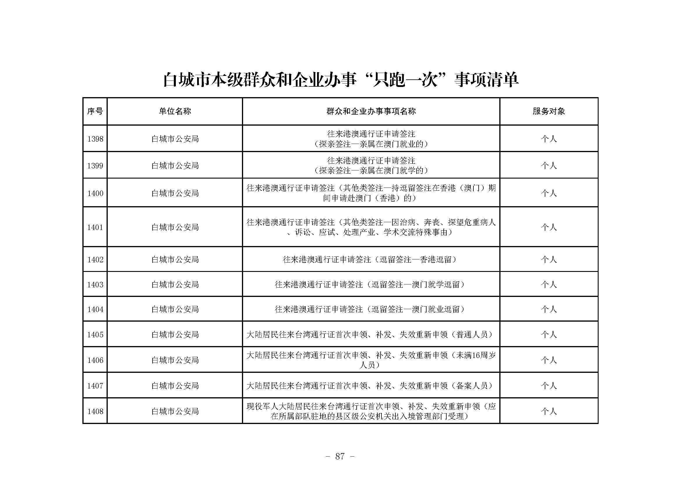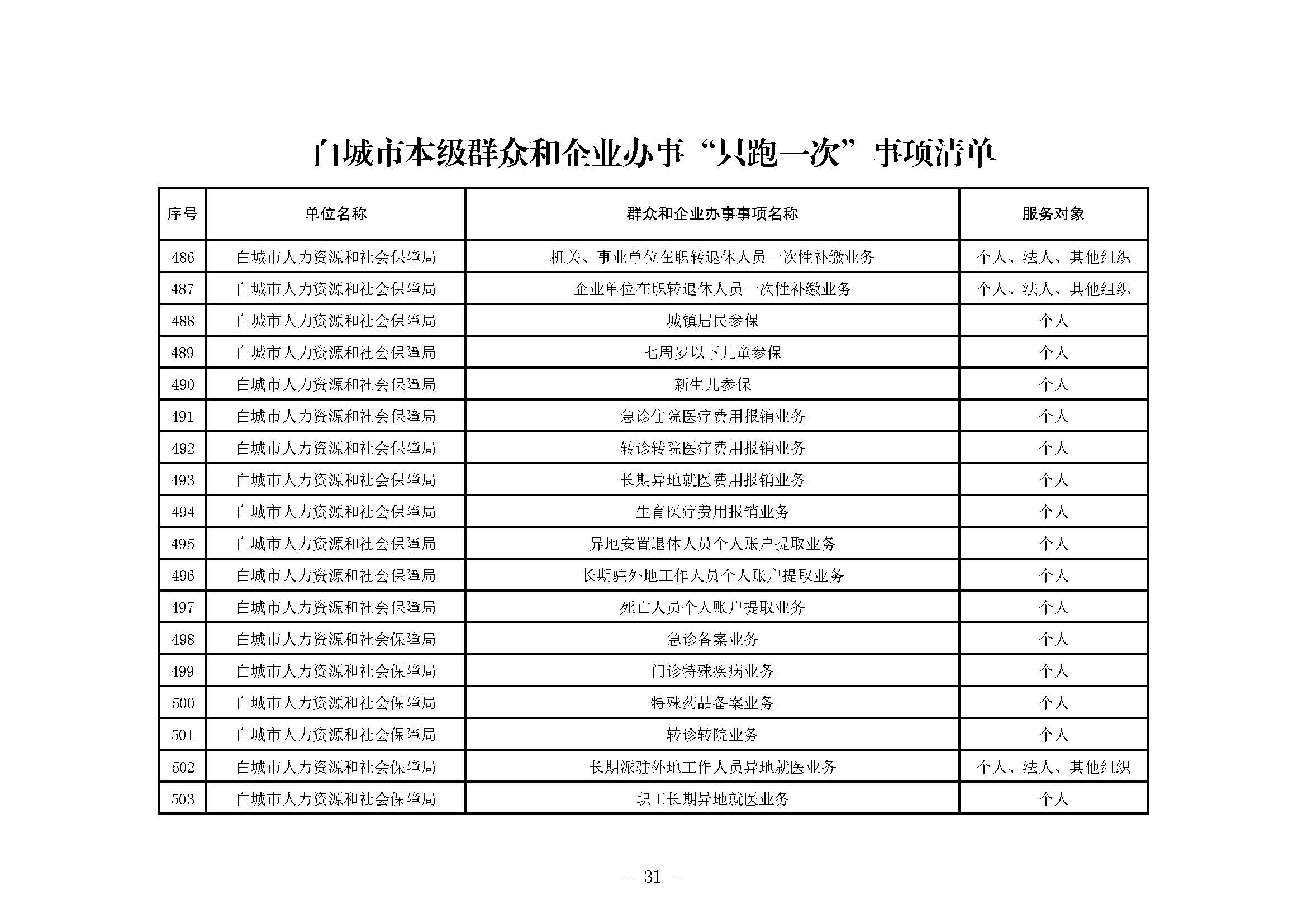 白城市市本级群众和企业办事“只跑一次”事项清单