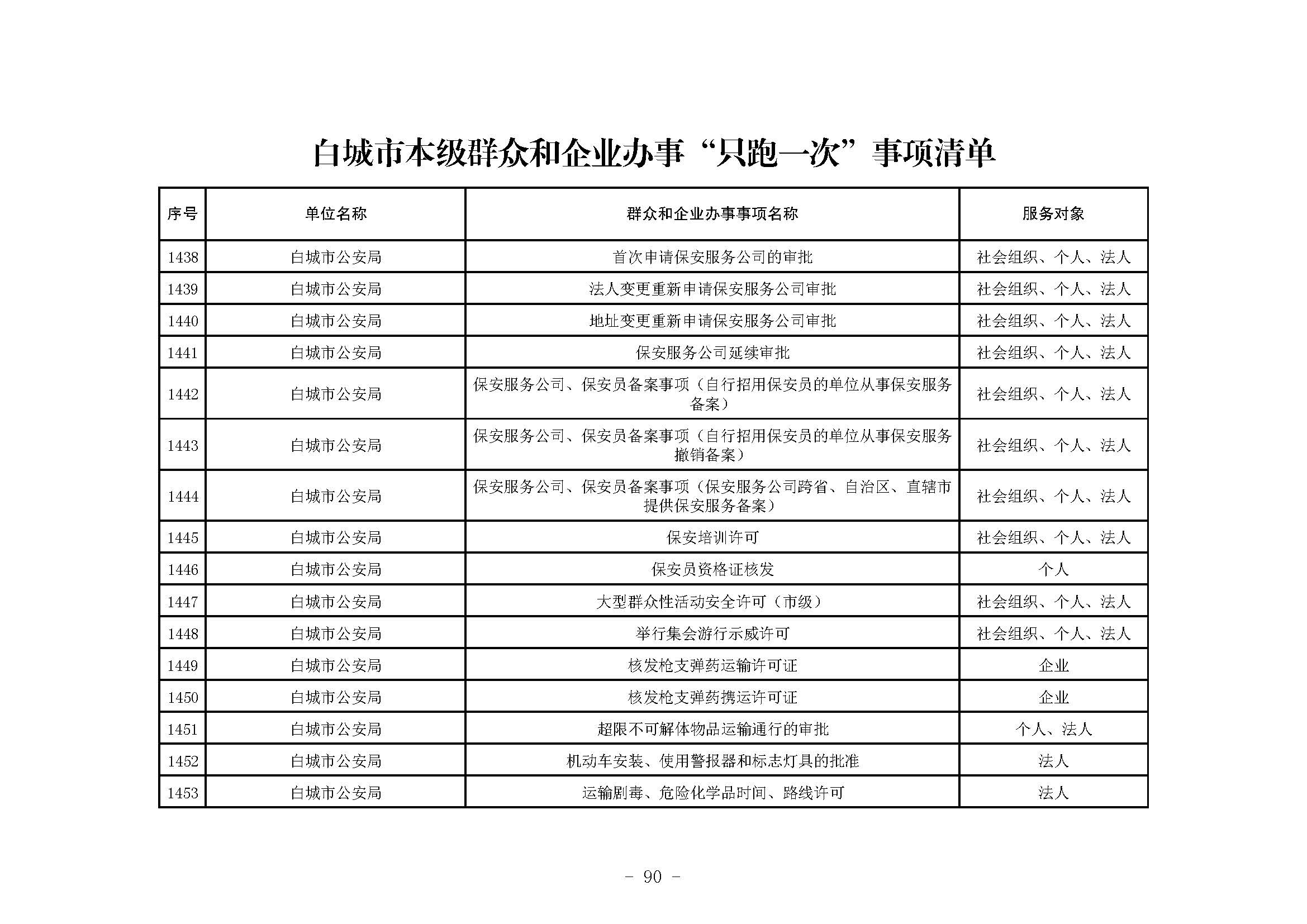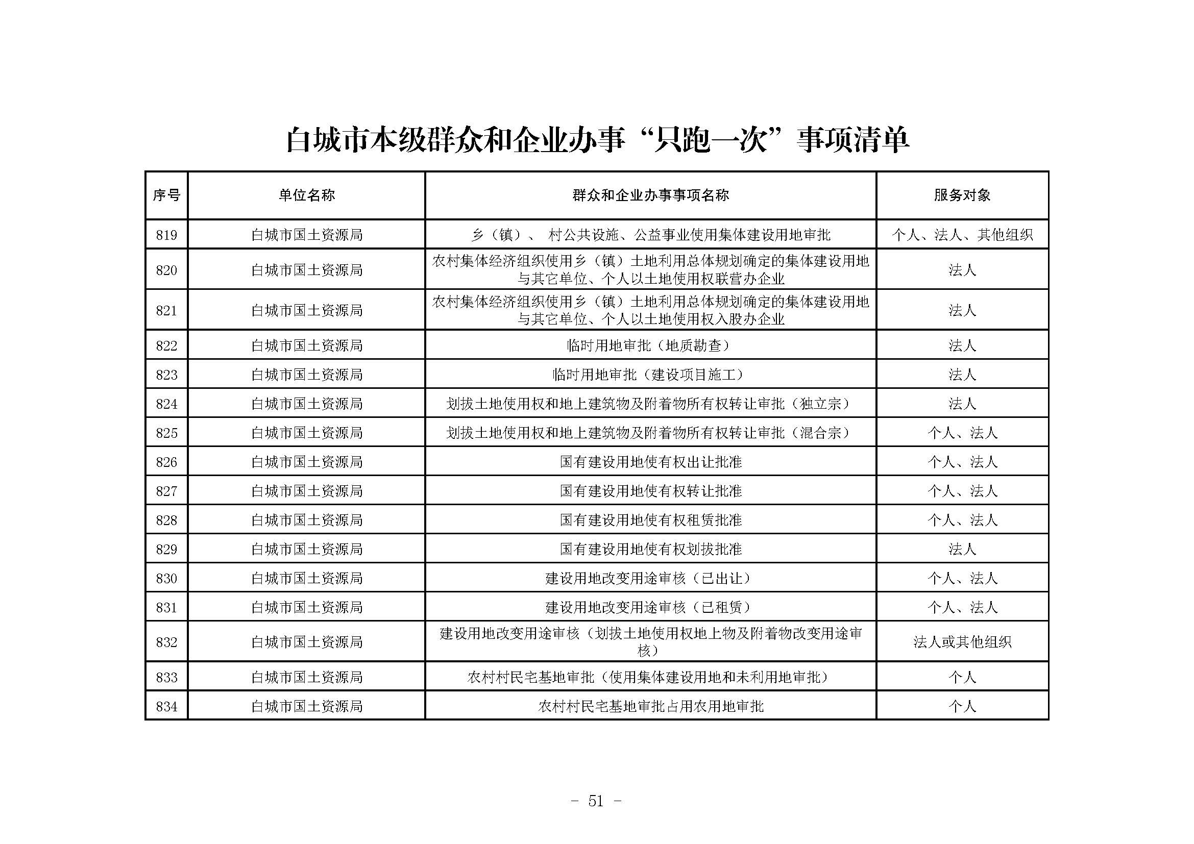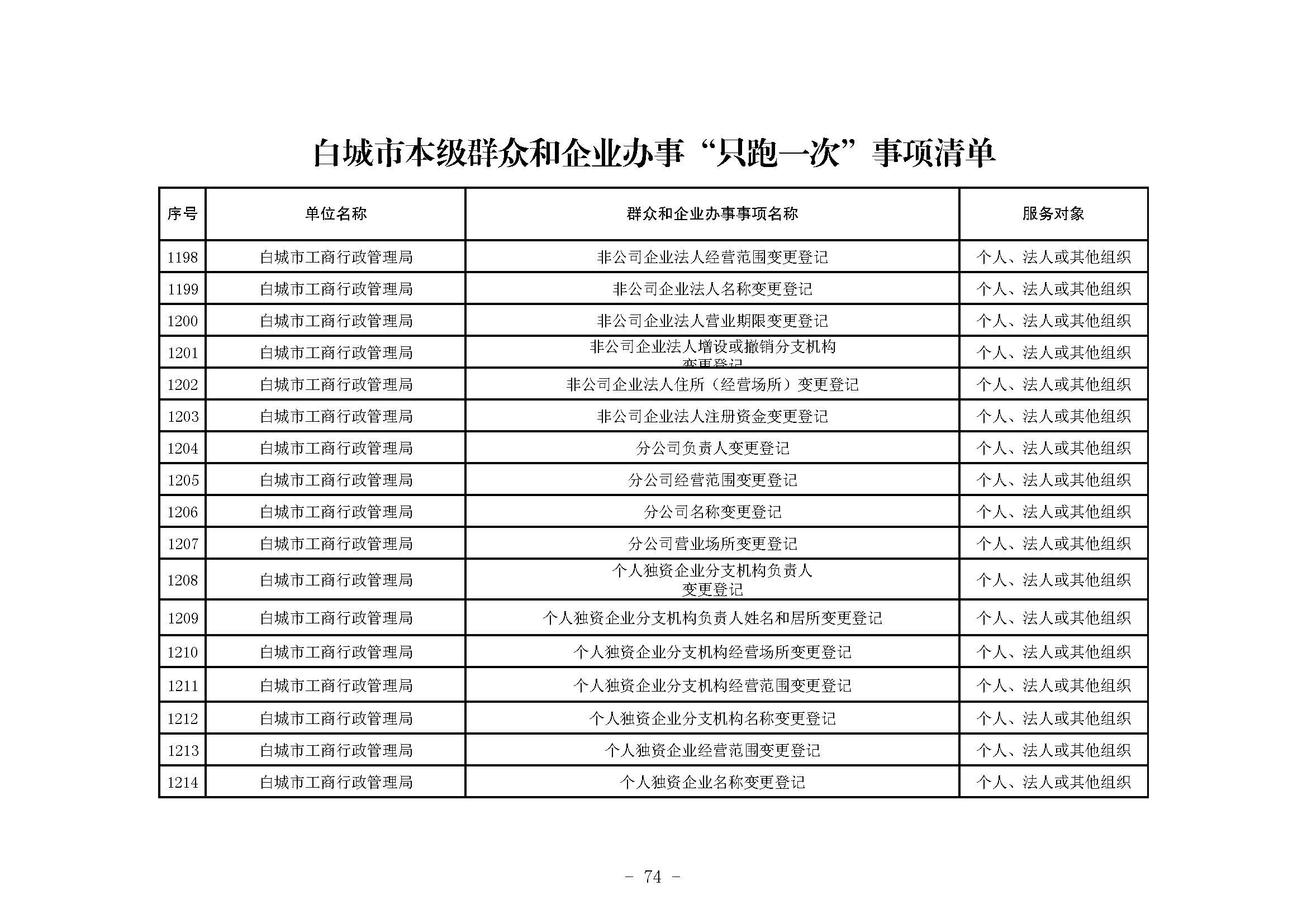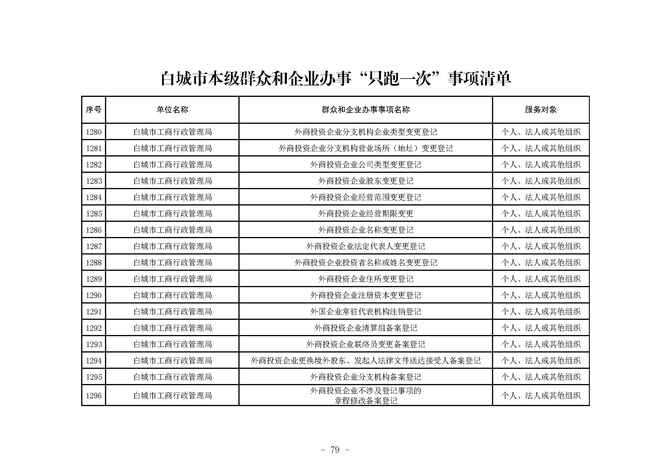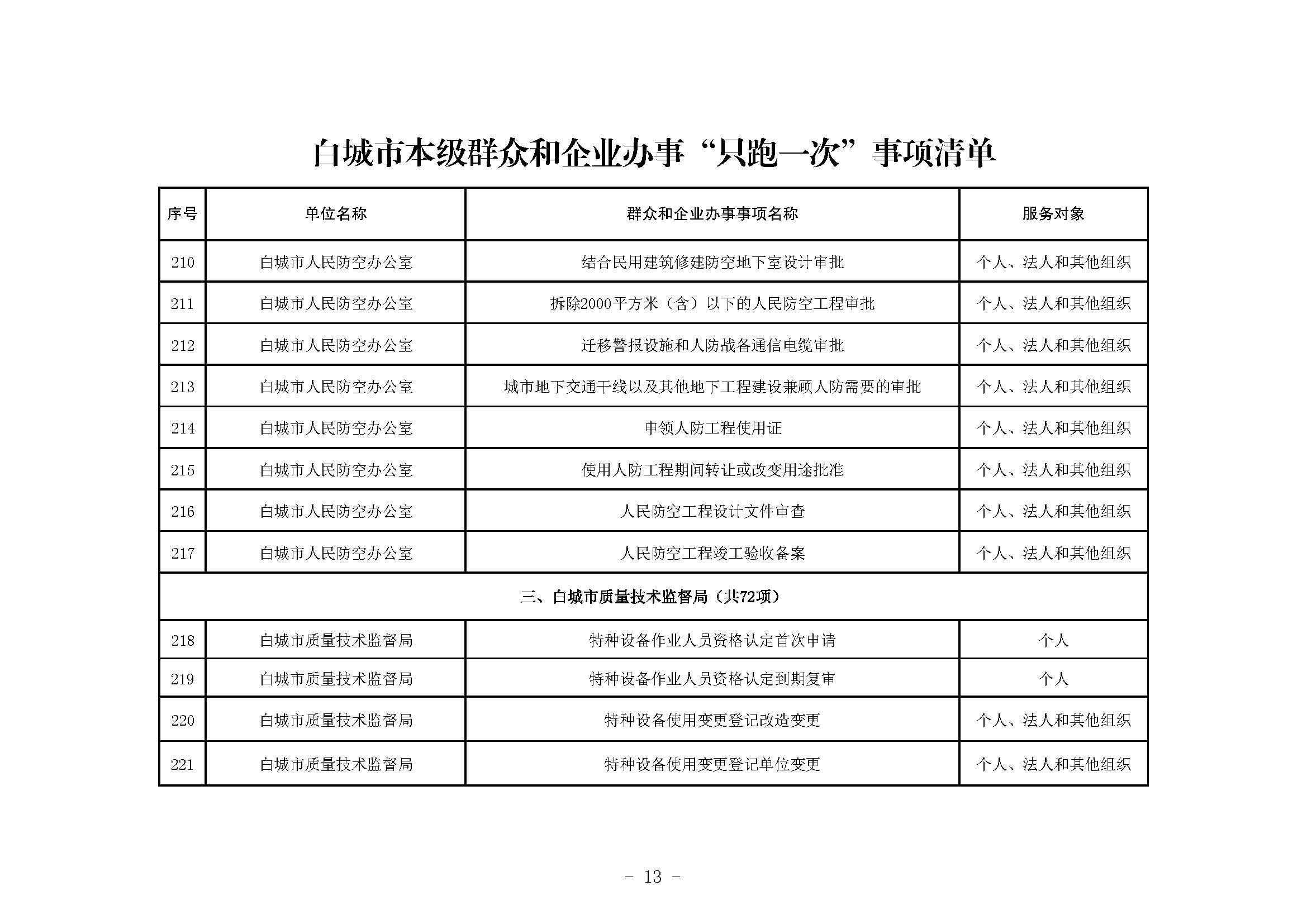 白城市市本级群众和企业办事“只跑一次”事项清单