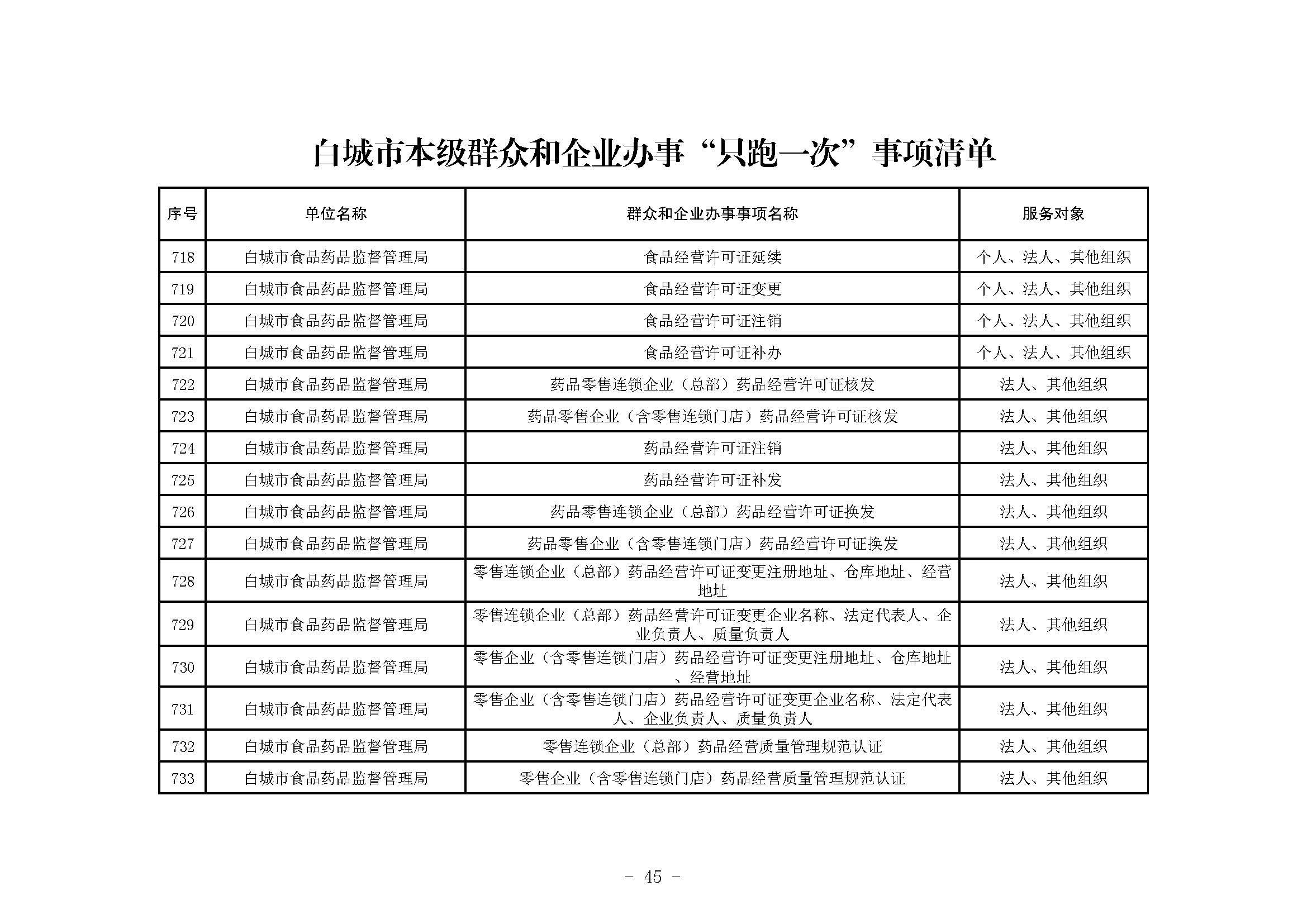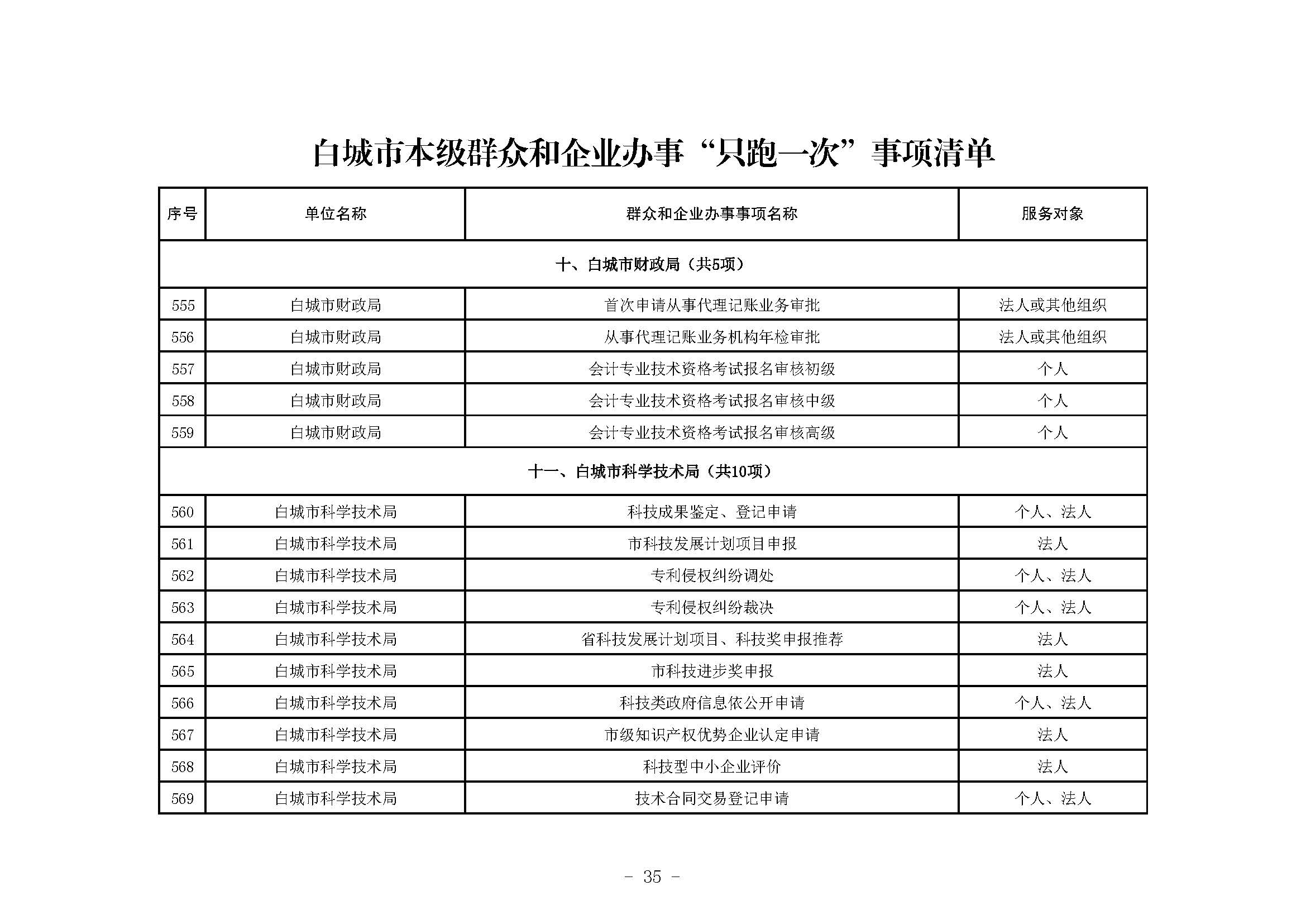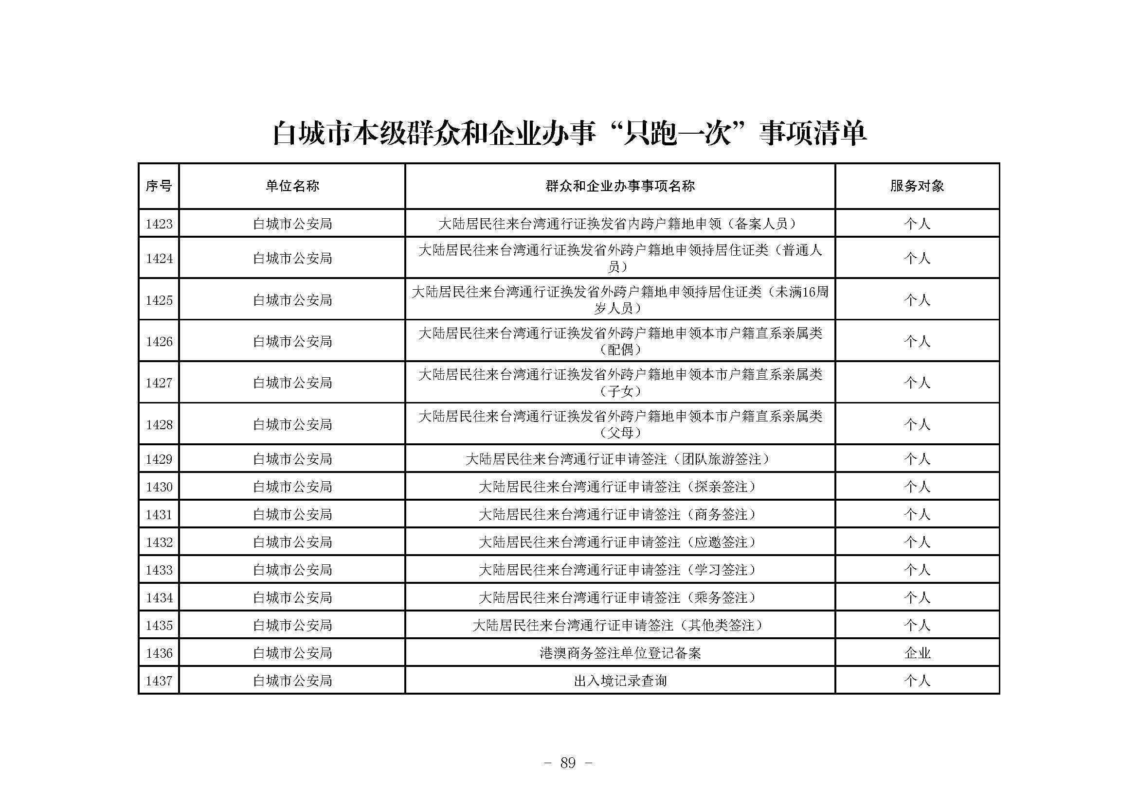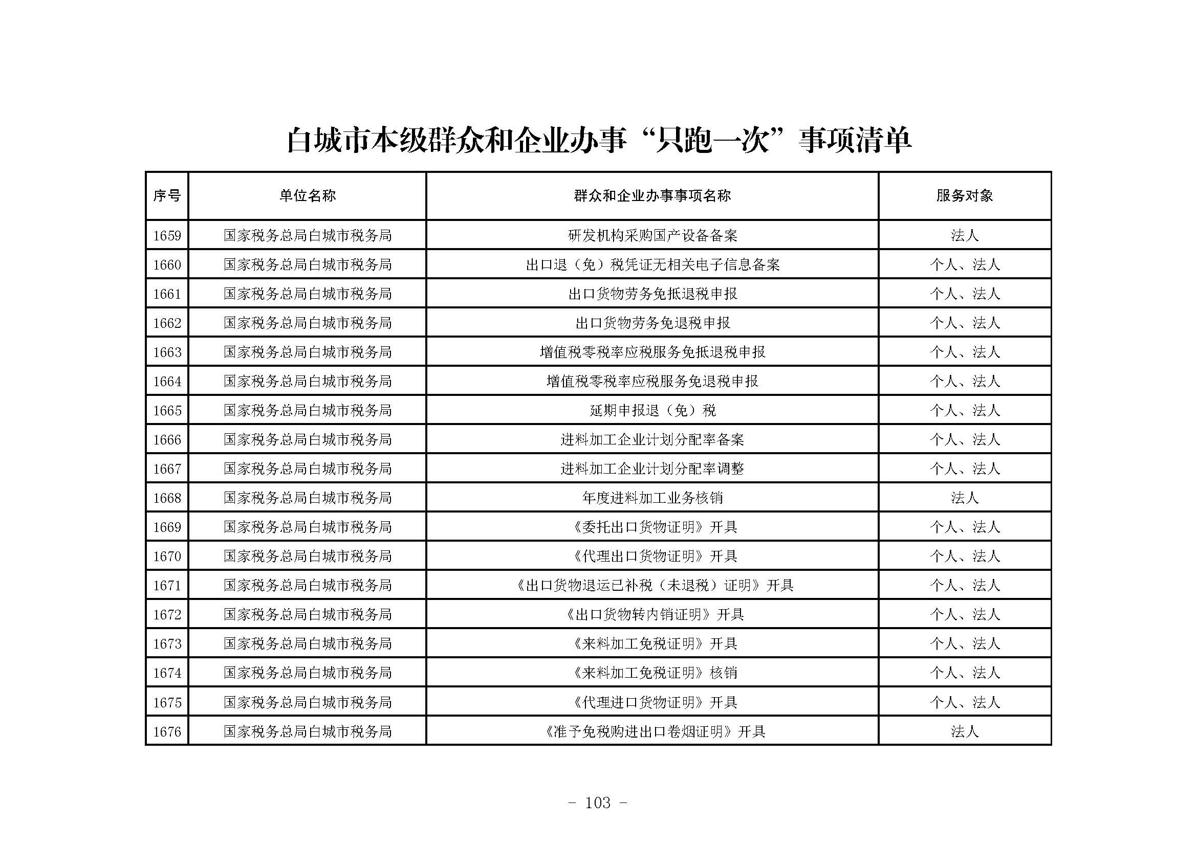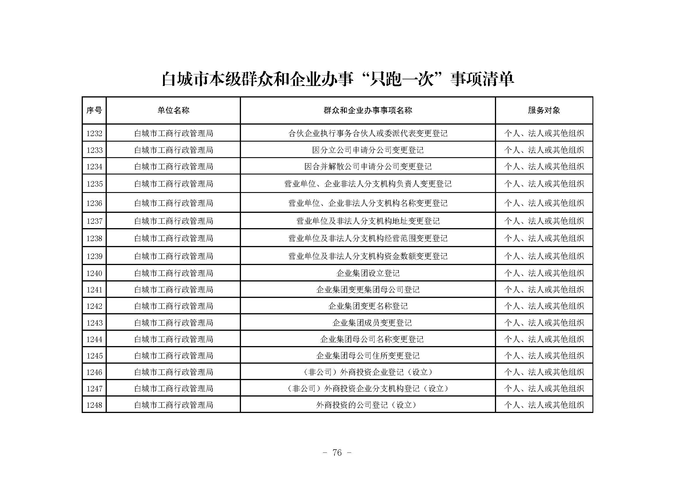 白城市市本级群众和企业办事“只跑一次”事项清单