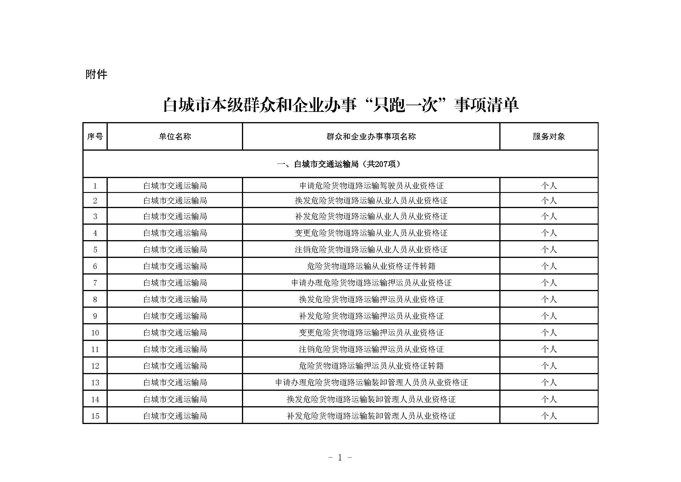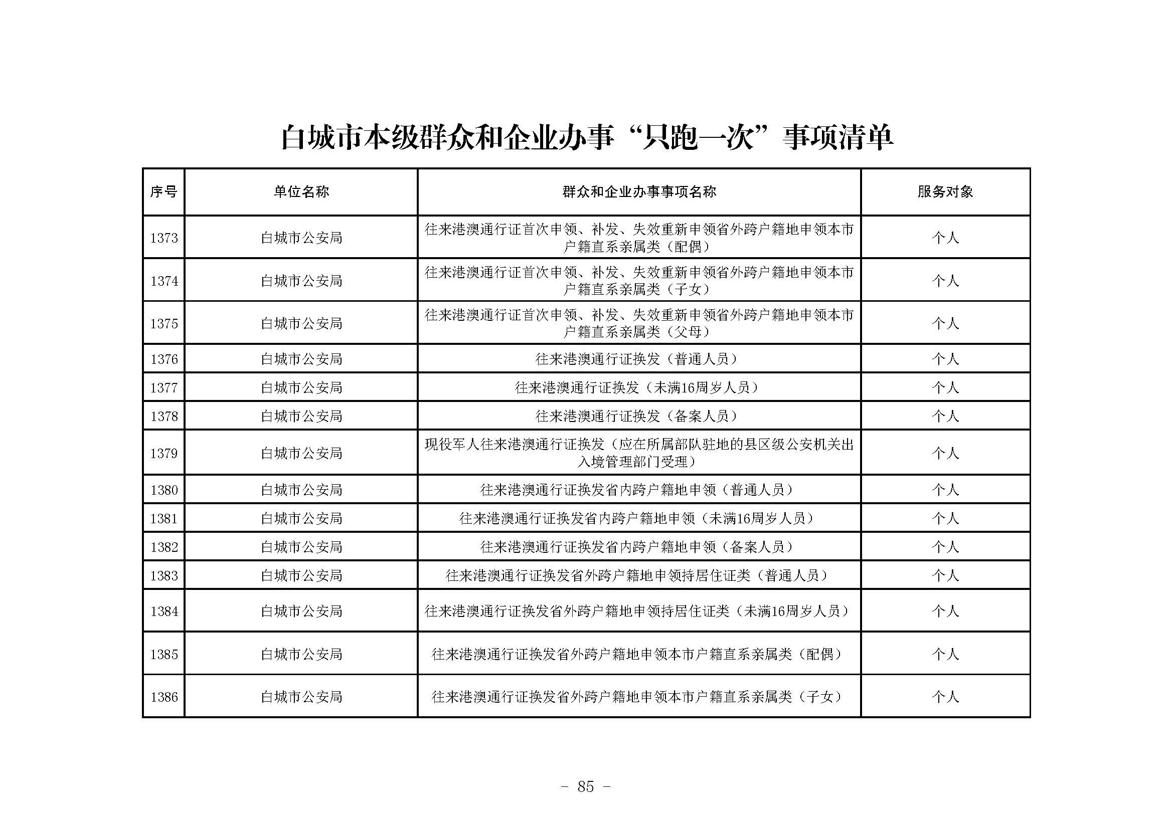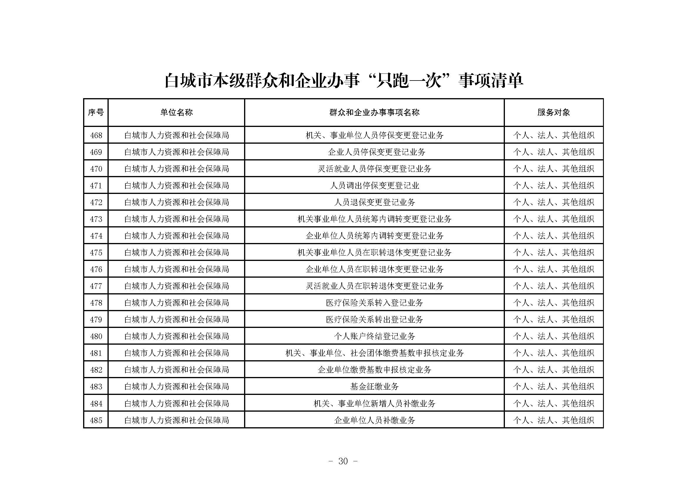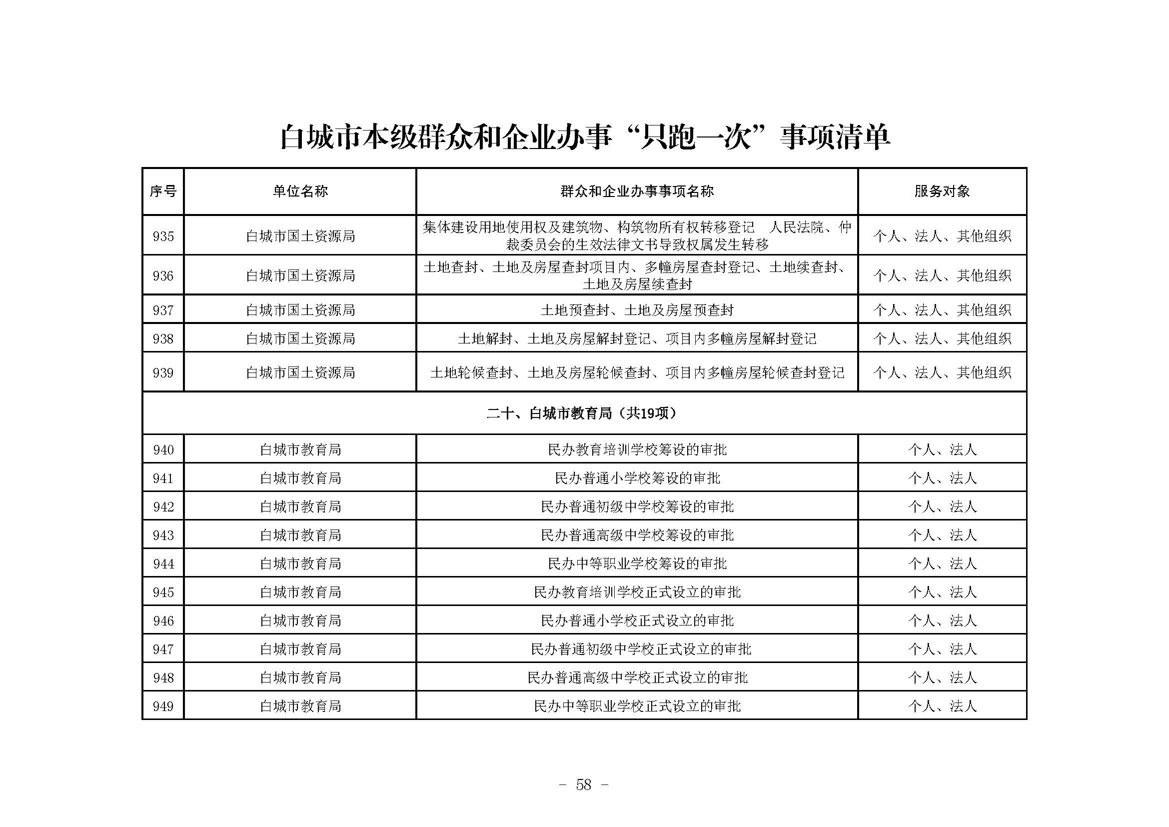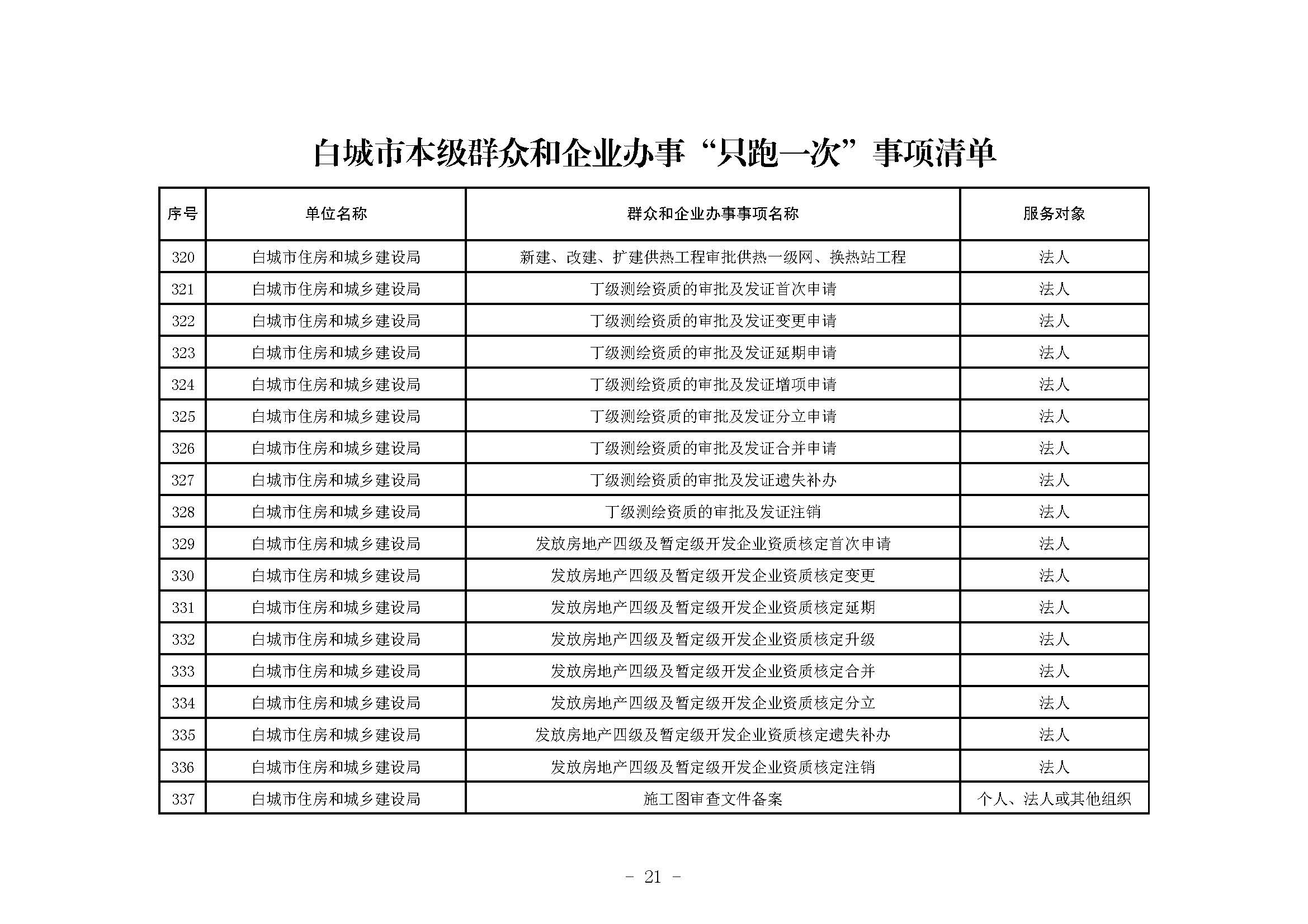 白城市市本级群众和企业办事“只跑一次”事项清单