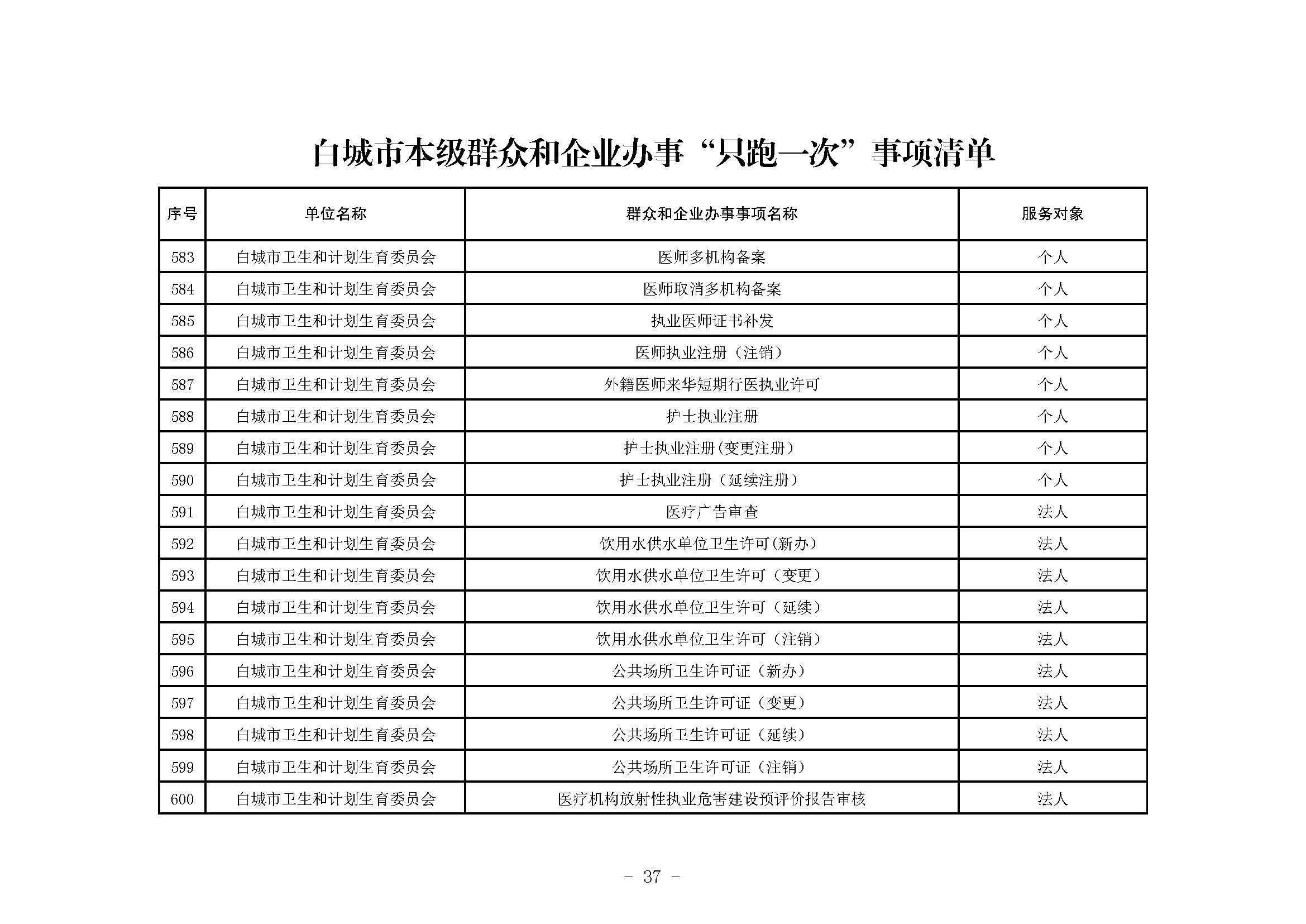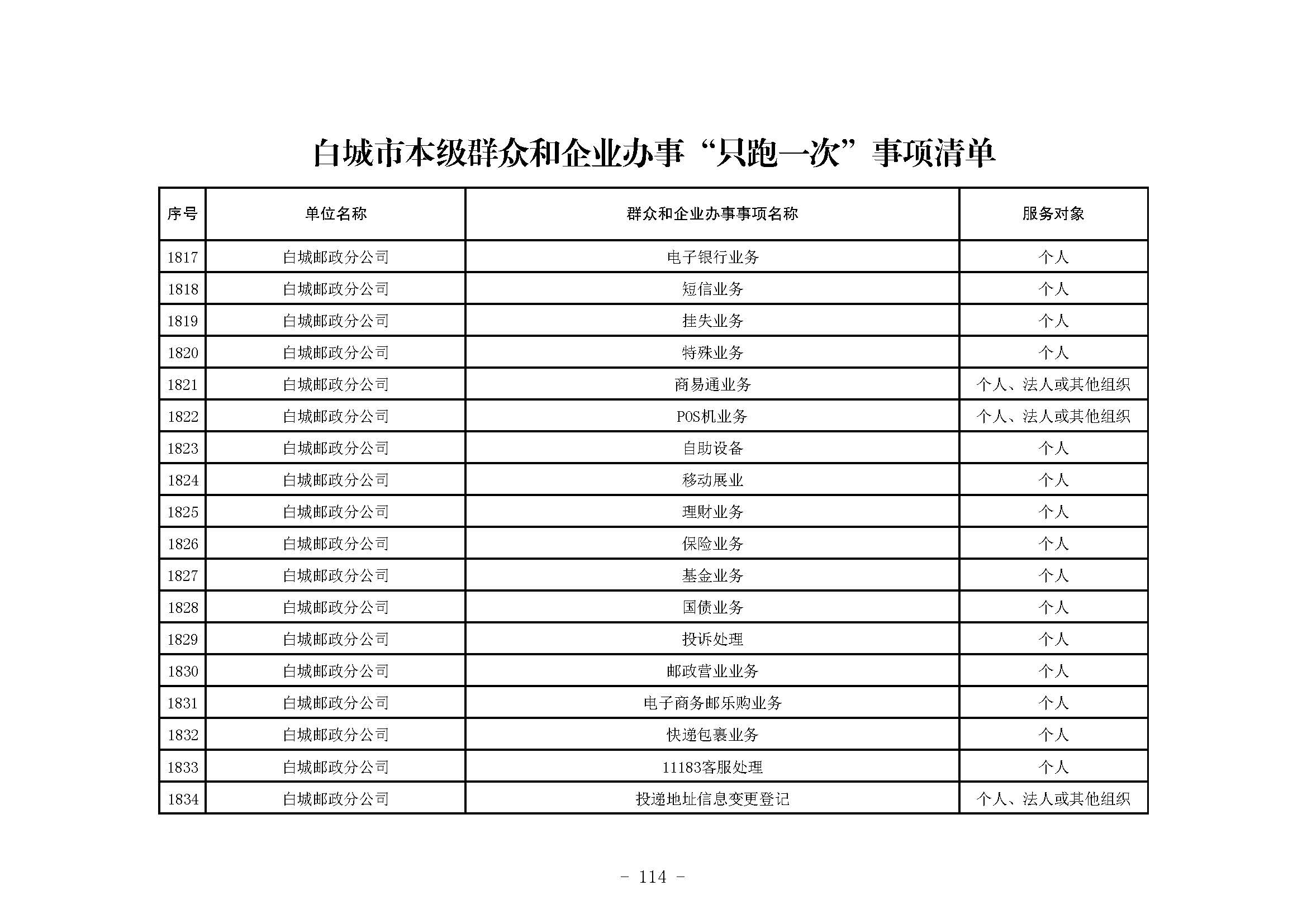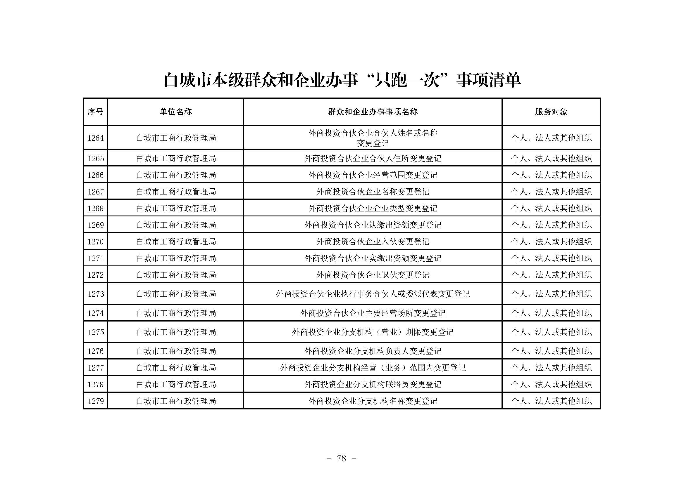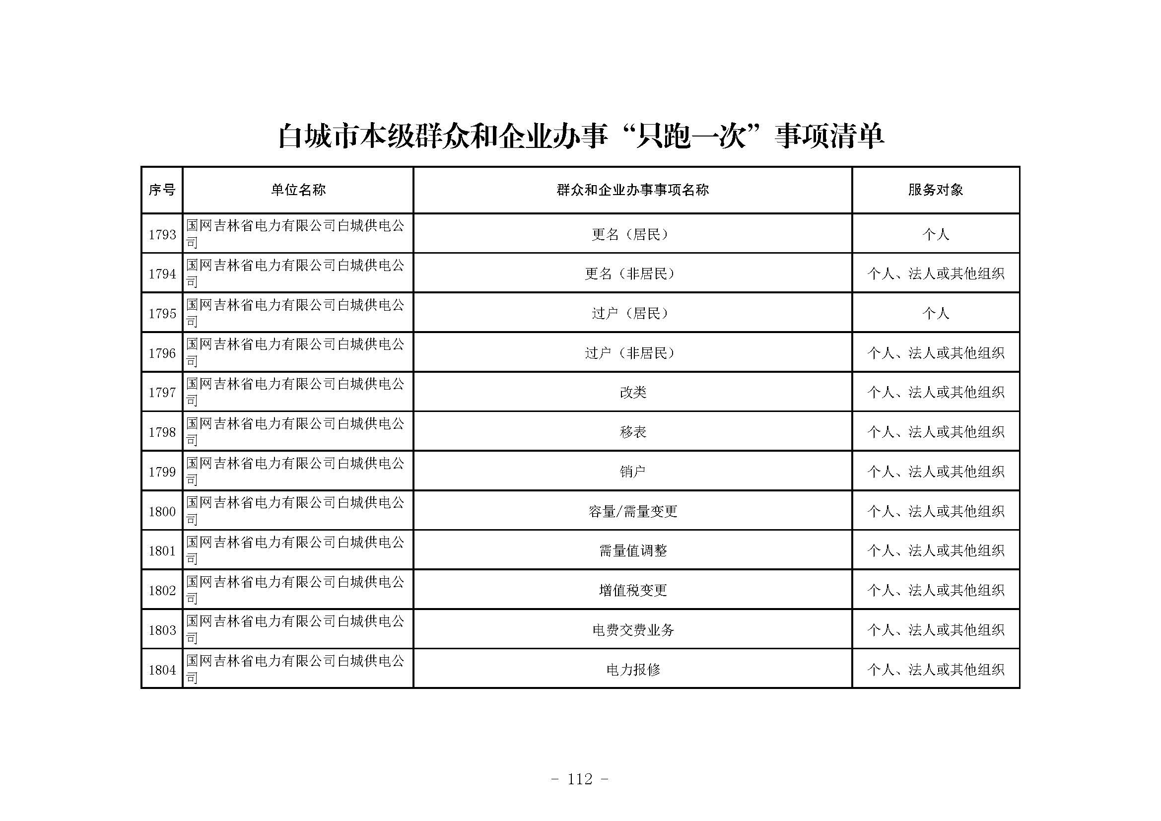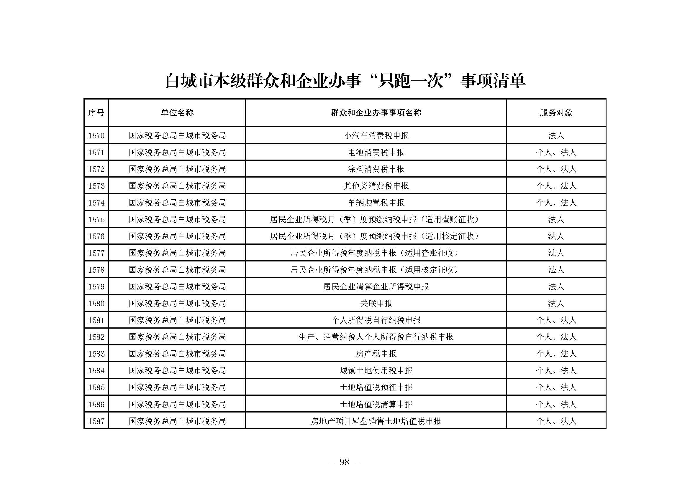 白城市市本级群众和企业办事“只跑一次”事项清单