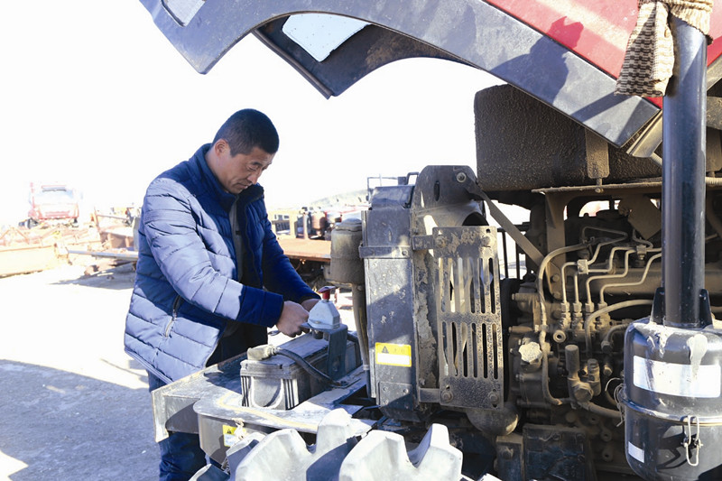通榆县团结铁牛农村合作社农民在修理农机具。