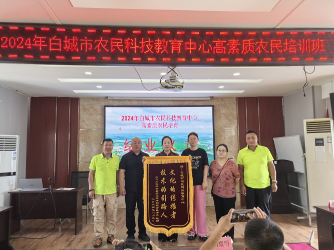 临别,班委会把代表全体学员感谢真情,上书“文化的传播者,技术的领路人”的一面锦旗送到领队姜秋菊手上。随后,依依惜别,返回农业战线。标志着历时15天的白城市高素质农民调训培训工作画上了完美句号。
