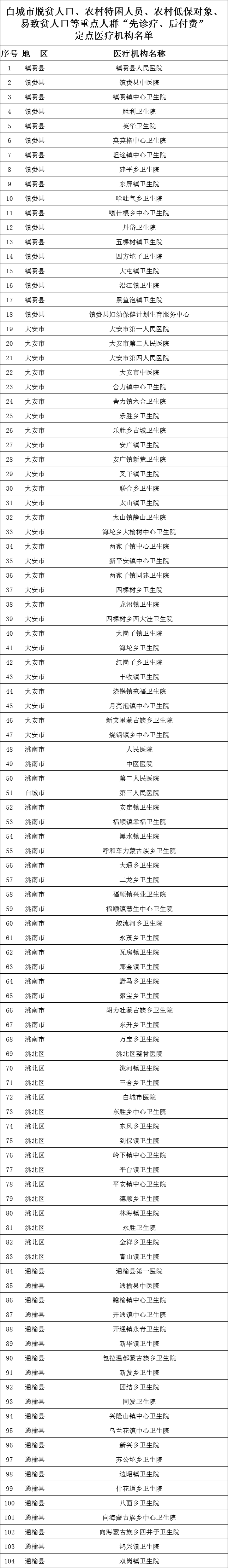 白城市脱贫人口、农村特困人员、农村低保对象、易致贫人口等重点人群“先诊疗、后付费”定点医疗机构名单