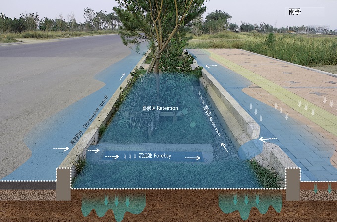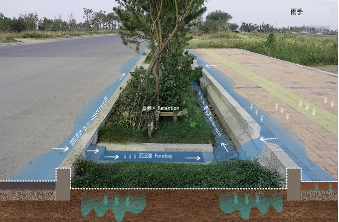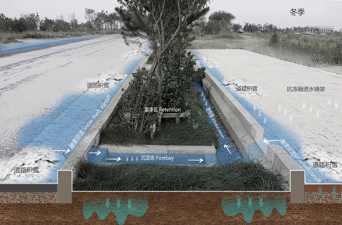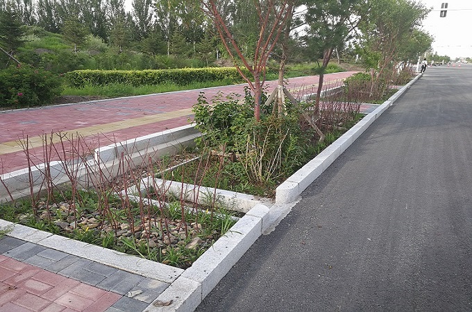 实现了道路融雪径流和初期雨水的优先渗滤净化与排放,并选择适合本地生长的抗碱性强的植物,解决了融雪剂侵害植物的问题。采用“面层透水砖/缝隙透水+变形缝、基层导排水”做法,解决了高纬度、高寒地区透水铺装冻胀破损问题。