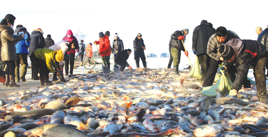 日前,作为大安市首届“嫩江湾冰雪节”活动重头戏之一的玉龙湖冬捕大幕拉开,冰湖腾鱼的壮观场景吸引众多游客前来观看和选购。此次玉龙湖冬捕计划捕捞优质鱼5万公斤。姜伟明摄.