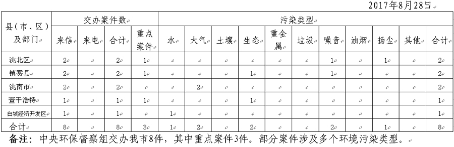 2017年8月28日22:00时,我市接到中央环境保护督察组交办的第十七批案件,共计8件。其中,重点案件3件。洮北区2件,镇赉县2件,洮南市2件,白城经济开发区1件,白城查干浩特旅游经济开发区1件。