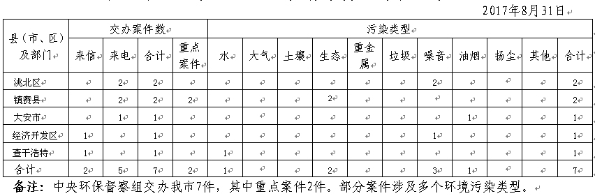 2017年8月31日15:00时,我市接到中央环境保护督察组交办的第二十批案件,共计7件。其中,重点案件2件。洮北区2件,镇赉县2件,大安市1件,经济开发区1件,查干浩特旅游开发区1件。