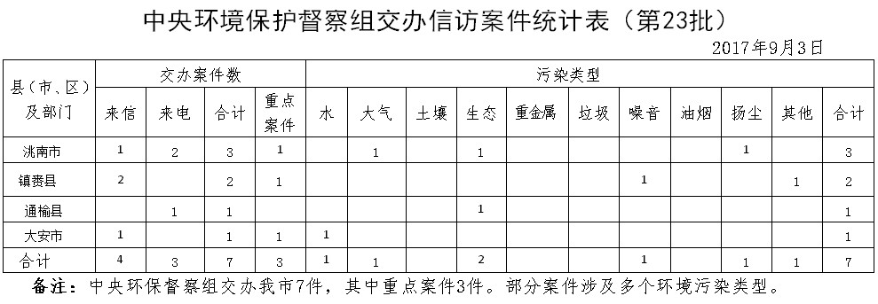 2017年9月3 日17 :50时,我市接到中央环境保护督察组交办的第二十三批案件,共计7件。其中,重点案件3件。洮南市3件、镇赉县2件,通榆县1件,大安市1件。