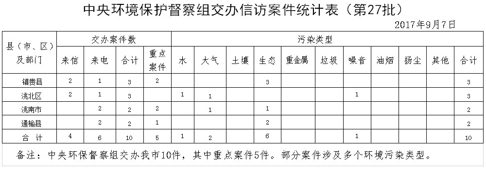2017年9月7日,我市接到中央环境保护督察组交办的第二十七批案件,共计10件。其中,重点案件5件。镇赉县3件,洮北区3件,洮南市2件,通榆县2件。