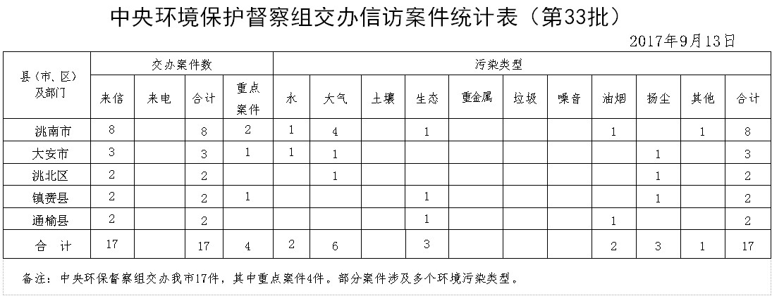 2017年9月13日,我市接到中央环境保护督察组交办的第三十三批案件,共计17件。其中,重点案件4件。洮南市8件,大安市3件,洮北区2件,镇赉县2件,通榆县2件。