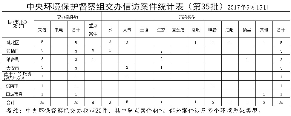 2017年9月15日,我市接到中央环境保护督察组交办的第三十五批案件,共计20件。其中,重点案件4件。洮北区8件,通榆县3件,镇赉县3件,大安市3件,白城查干浩特旅游经济开发区1件,洮南市1件,白城市1件。