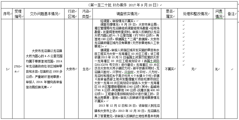 白城市群众信访举报转办和边督边改公开情况一览表(第一至二十批补办案件2017年9月20日)